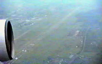 いよいよディセントを始め、日本のようです。まだ雲があって下がぜんぜん見えません。天気がよくないようで、雲に入るときにはシートベルト着用のサインがでました。窓から見ていたらエンジンナセルが大きく揺れ、主翼も上下にたわんでいるのが肉眼でもわかります。怖いような気がしますが、あそこで吸収してくれなければ機体がグラグラ揺れるわけですね。かなり降下して雲がきれたとき初めて陸地が見えました。非常に入り組んだ海岸線で、私は志摩半島あたりじゃないかと思ったのですが、隣の席の人はホノルルからの航路は成田をめざしてそのまま新潟方面に抜け、そこで旋回して北から名古屋に着陸するからそっちじゃないと主張します。でもどうも本州を横断するのに地上がわかるほど低くは飛ばないような気がするんだけどなぁ。